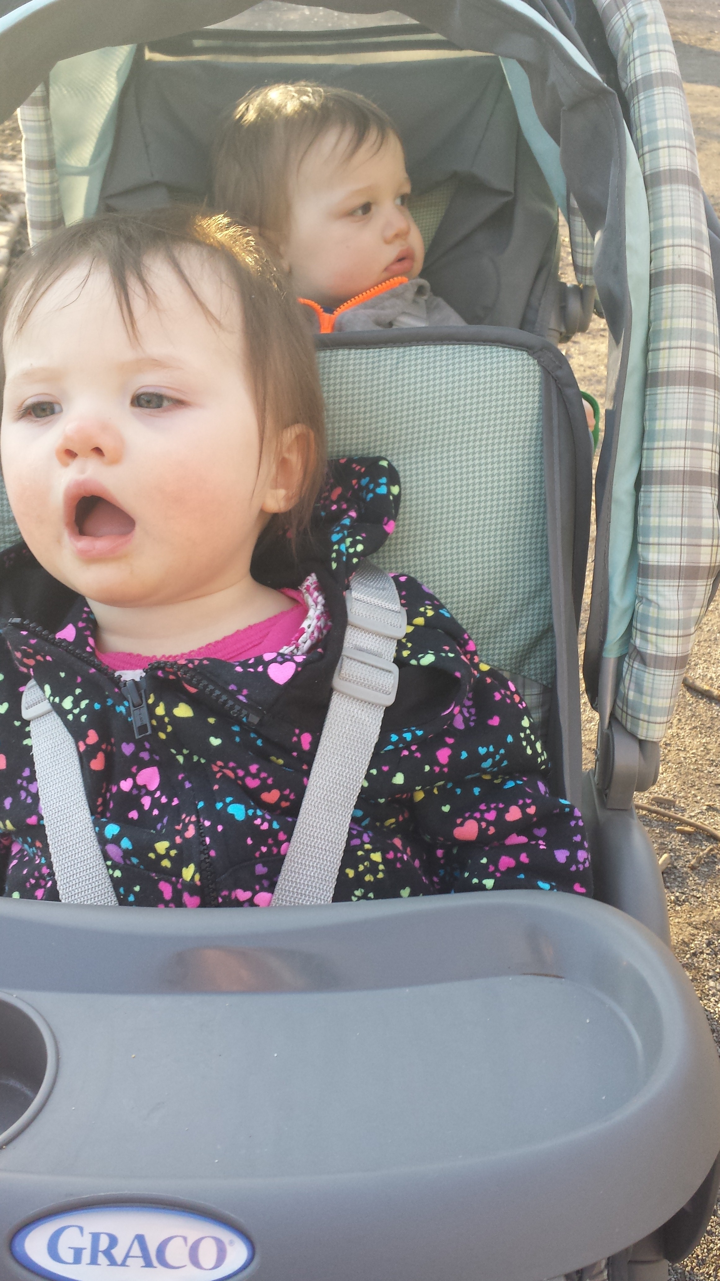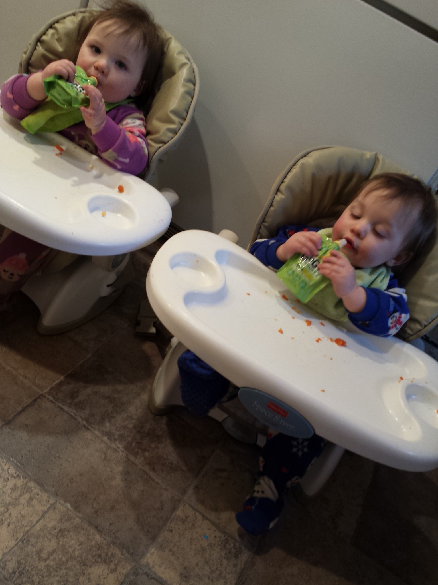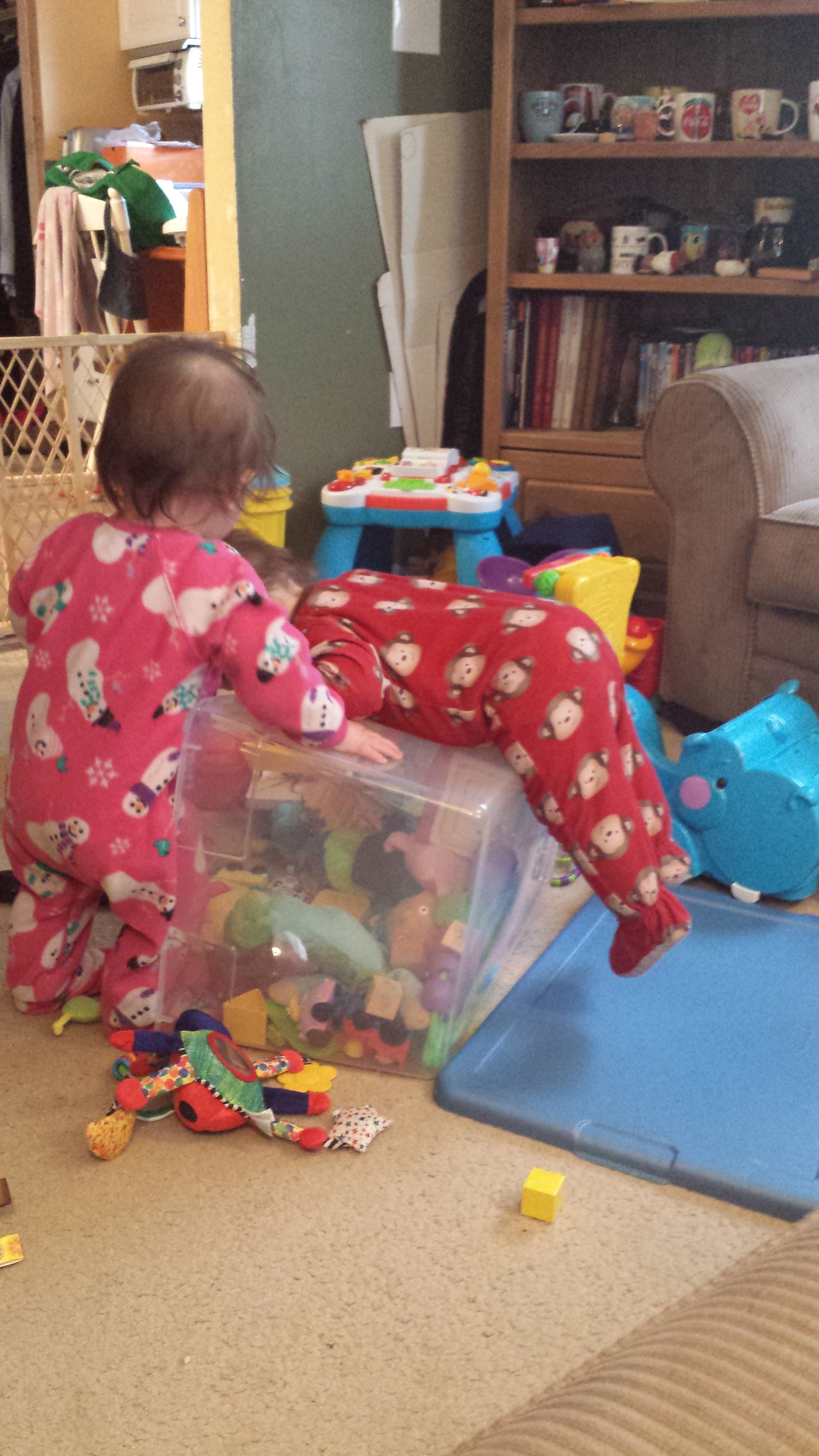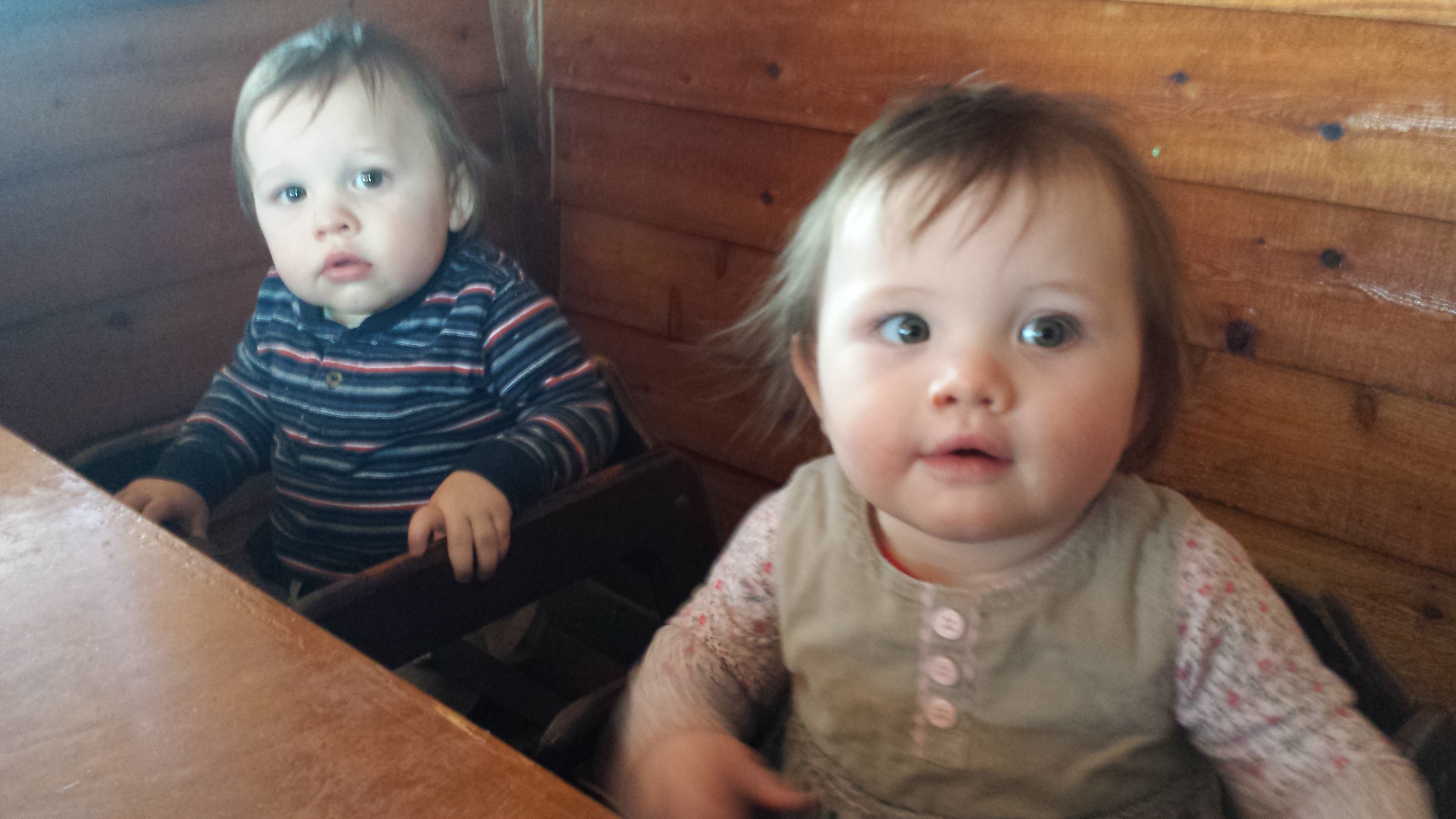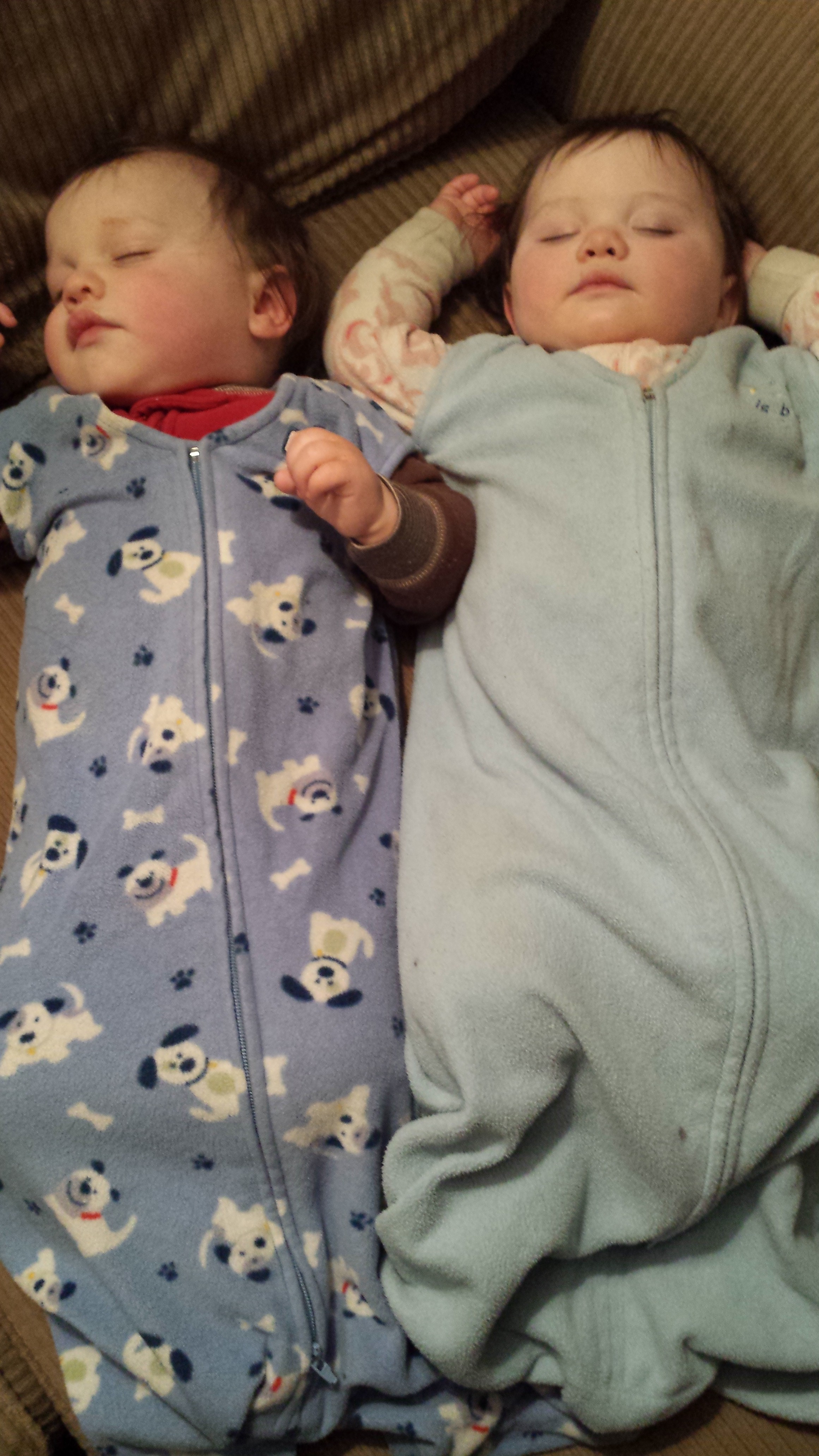 They have quite a few words between the two of them. Both can say: more, kitty, no, mama, Hannah, banana, Caitlyn, woof, bottle, hiya, hi, hello, ball, night night and thank you. Molly can also say shake. Gus also says: Go (usually shaking his finger and always “go go go!”), tickle and sock. Both love to give kisses and hugs, and know how to high five. They pretend lots of toys are phones and put them to their ears and say “hewwoo?” and it’s adorable. They sleep pretty well, though Gus has been ending up in our bed for a good chunk of the night recently. They eat pretty much everything we do, and BOY can they ever eat. They eat a ton. They are pretty delightful little toddlers.