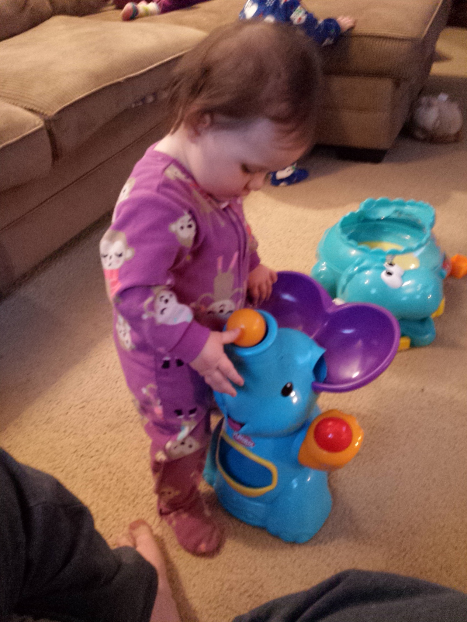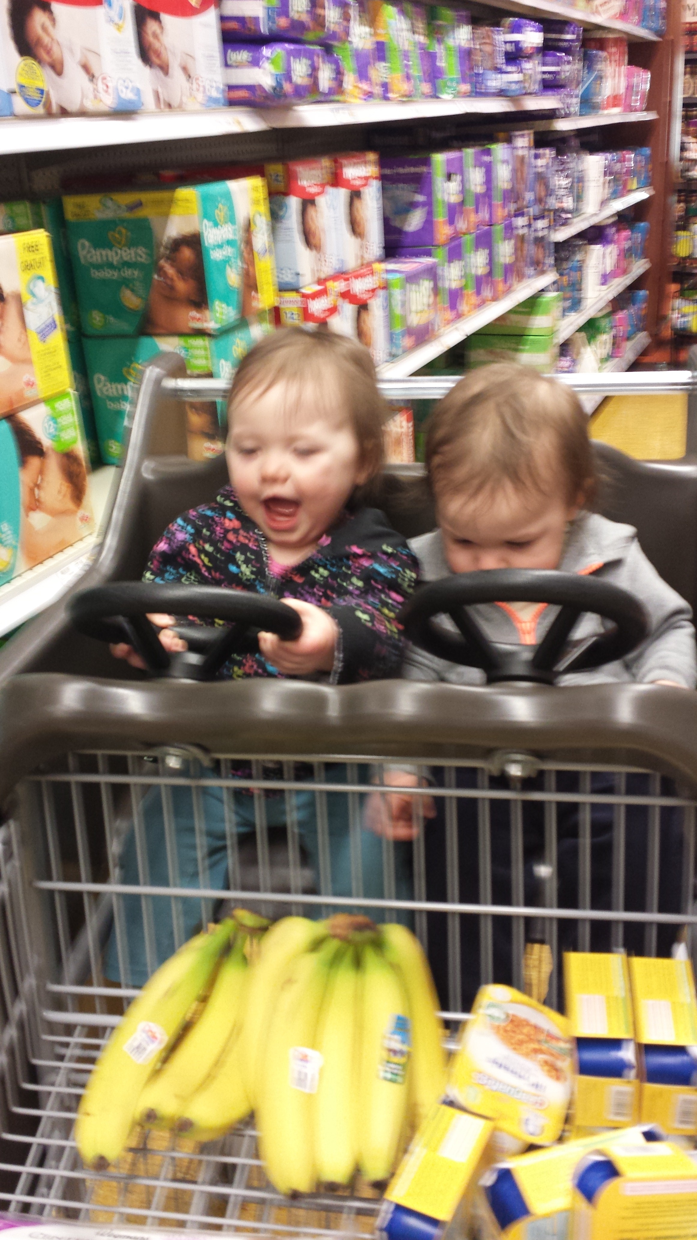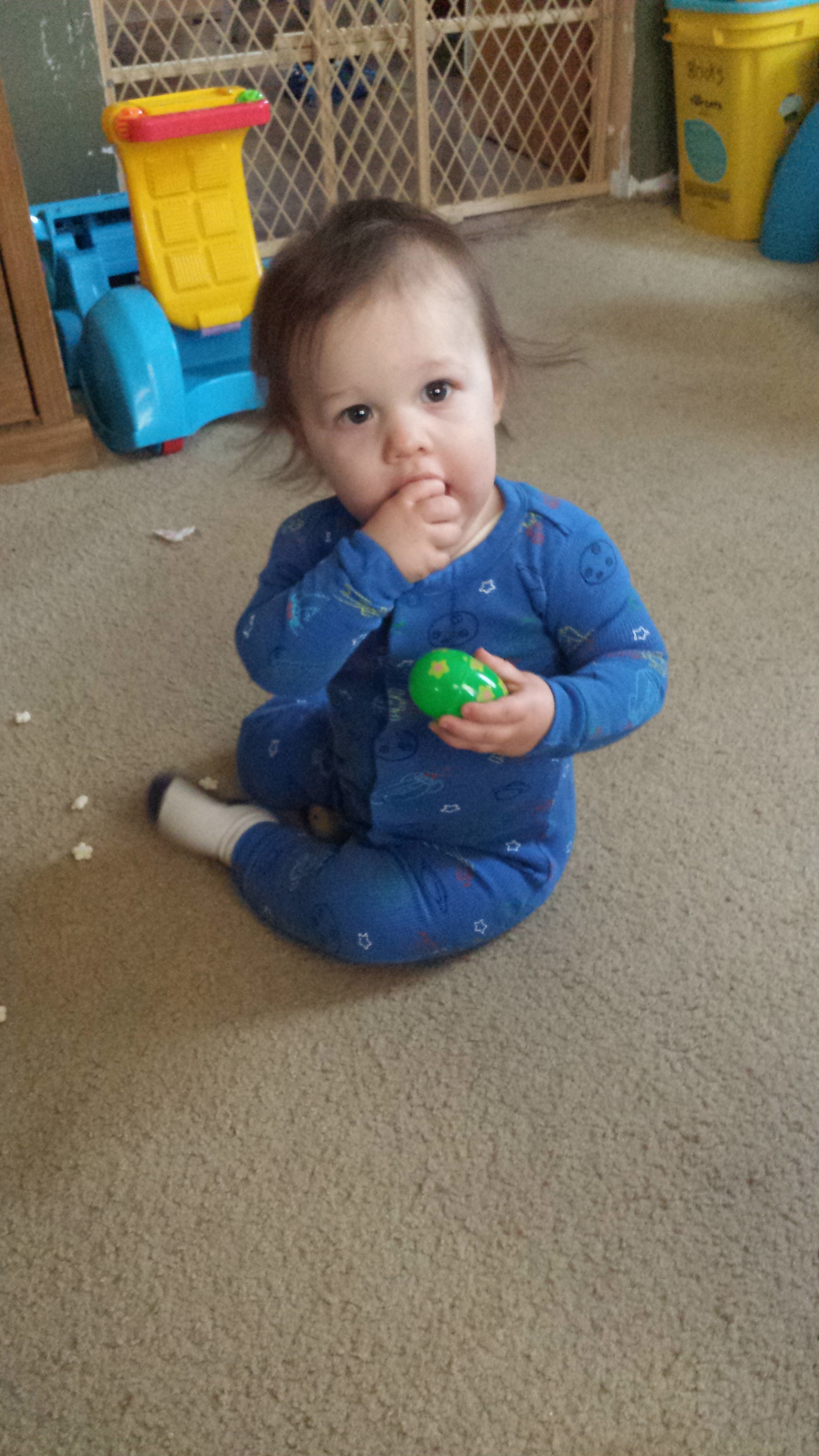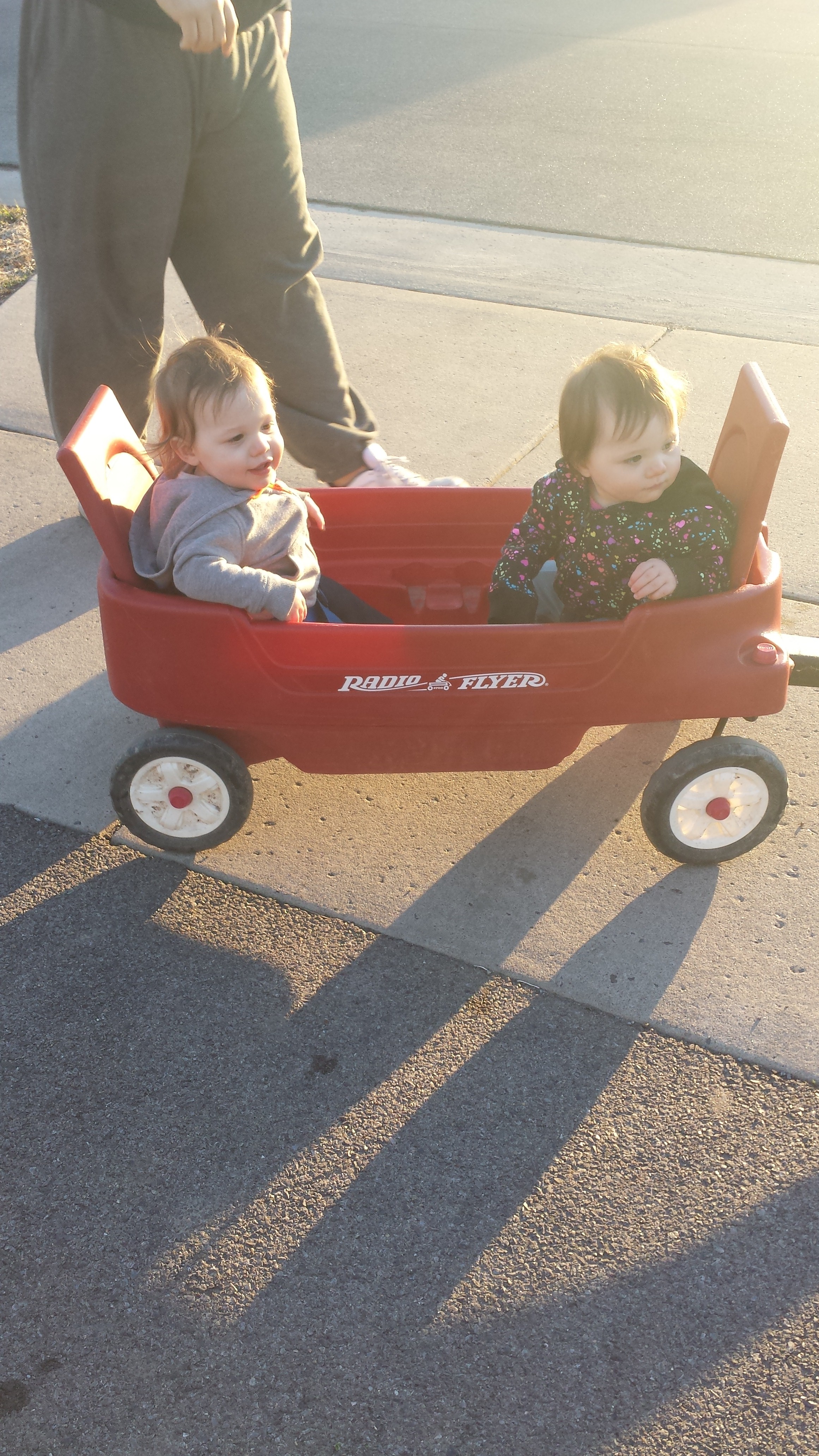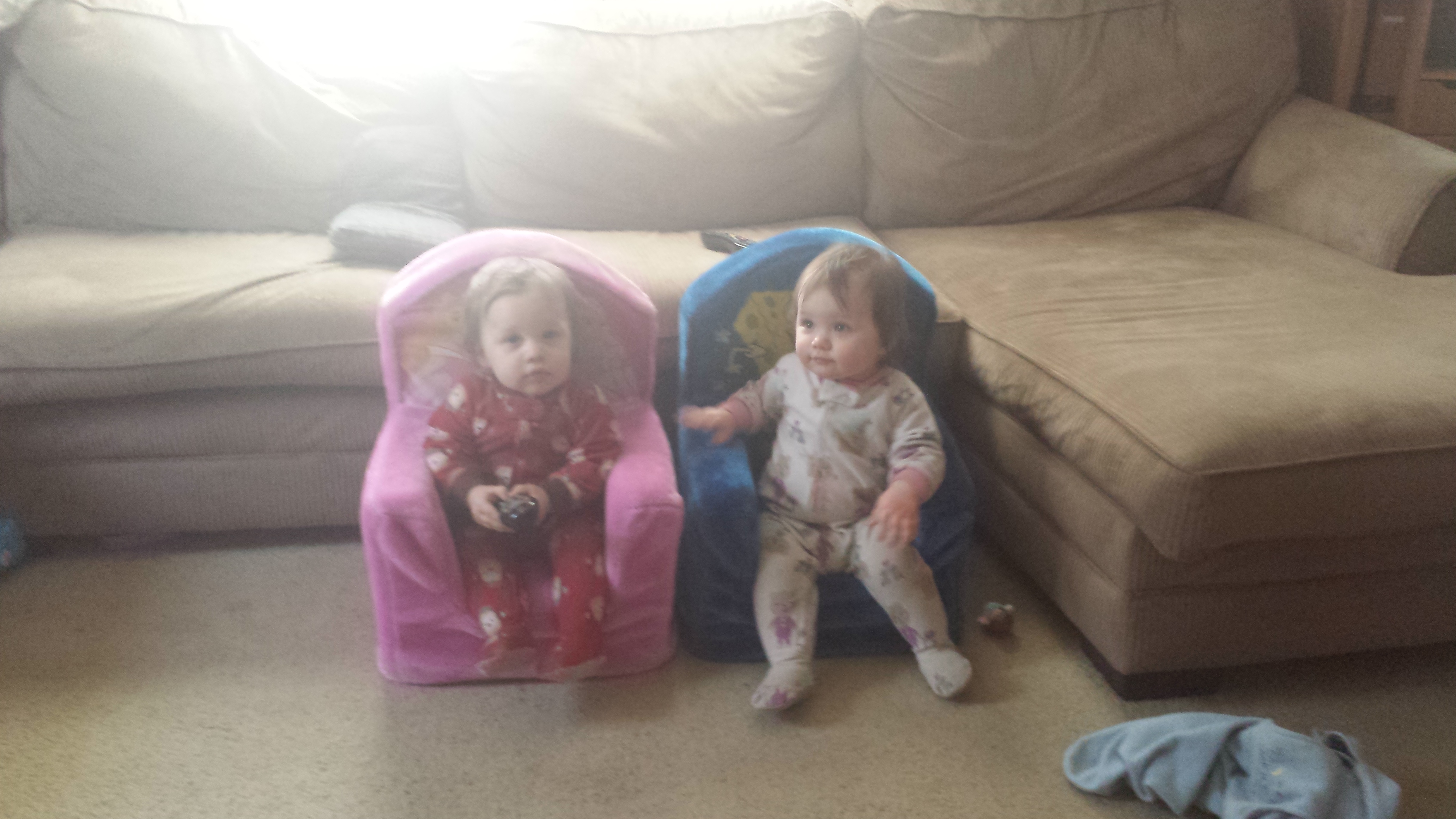 They have quite a few words between the two of them. Both can say: more, kitty, no, mama, Hannah, banana, Caitlyn, woof, bottle, hiya, hi, hello, ball, night night and thank you. Molly can also say shake. Gus also says: Go (usually shaking his finger and always “go go go!”), tickle and sock. Both love to give kisses and hugs, and know how to high five. They pretend lots of toys are phones and put them to their ears and say “hewwoo?” and it’s adorable. They sleep pretty well, though Gus has been ending up in our bed for a good chunk of the night recently. They eat pretty much everything we do, and BOY can they ever eat. They eat a ton. They are pretty delightful little toddlers.