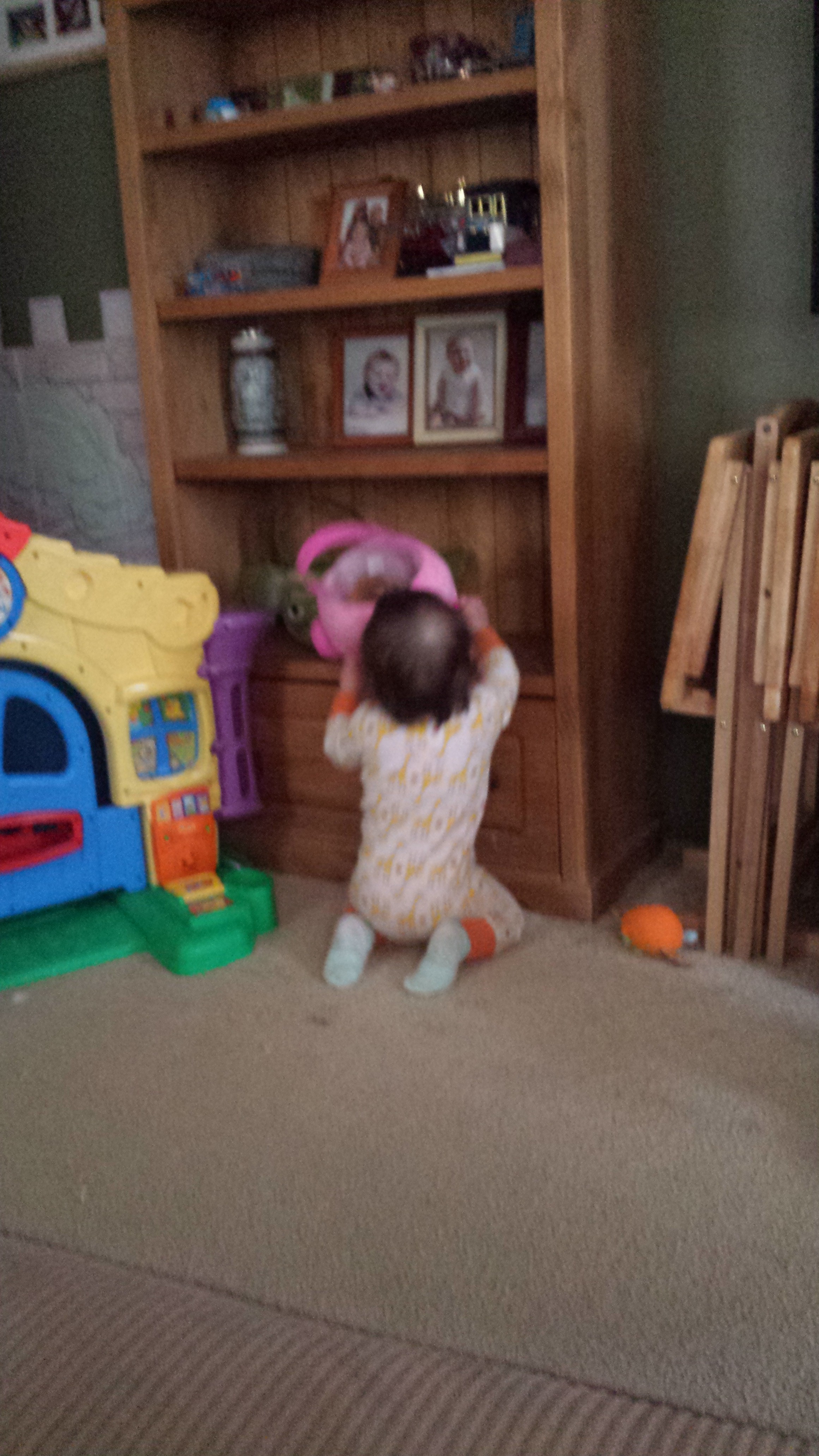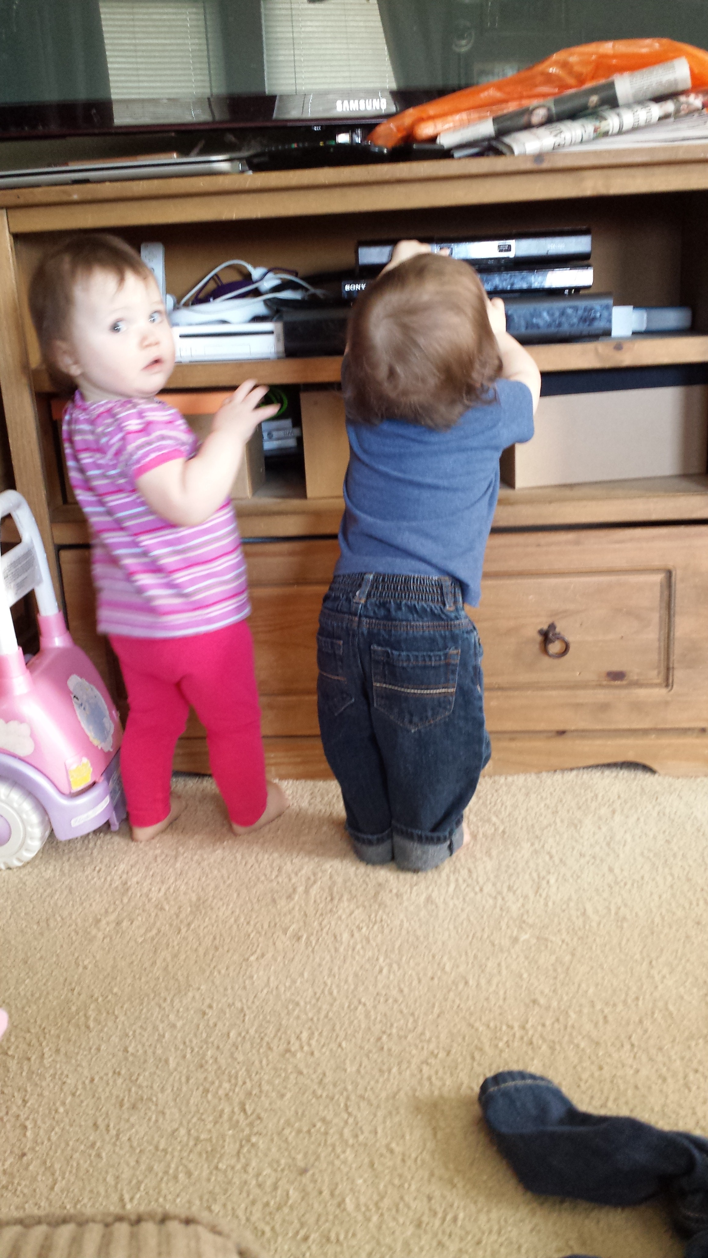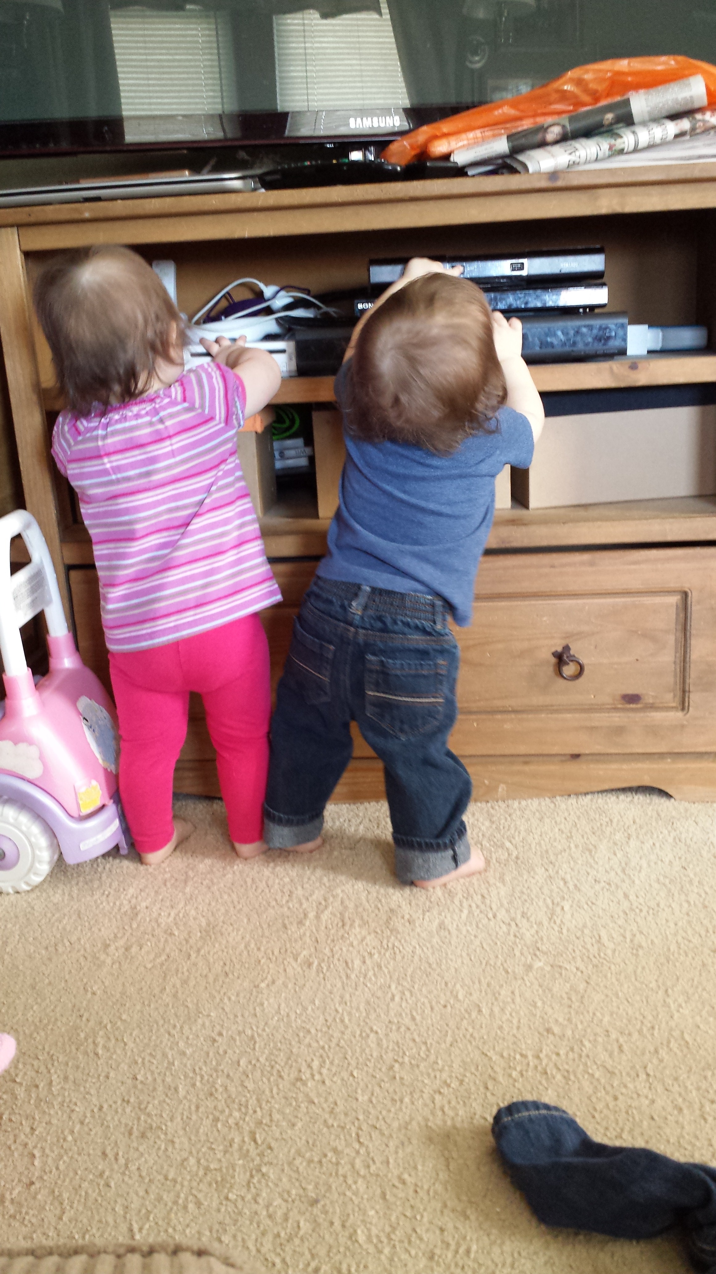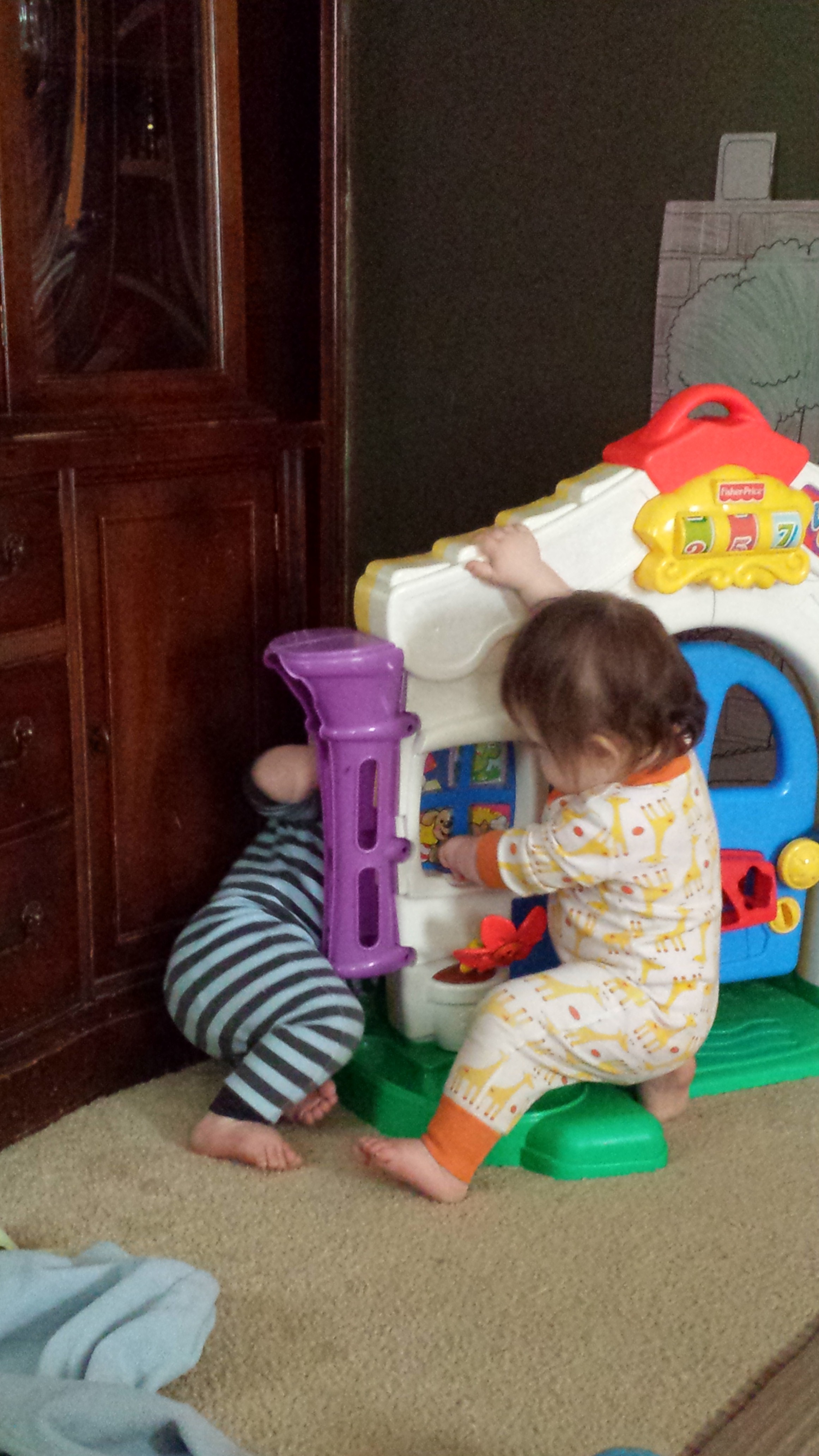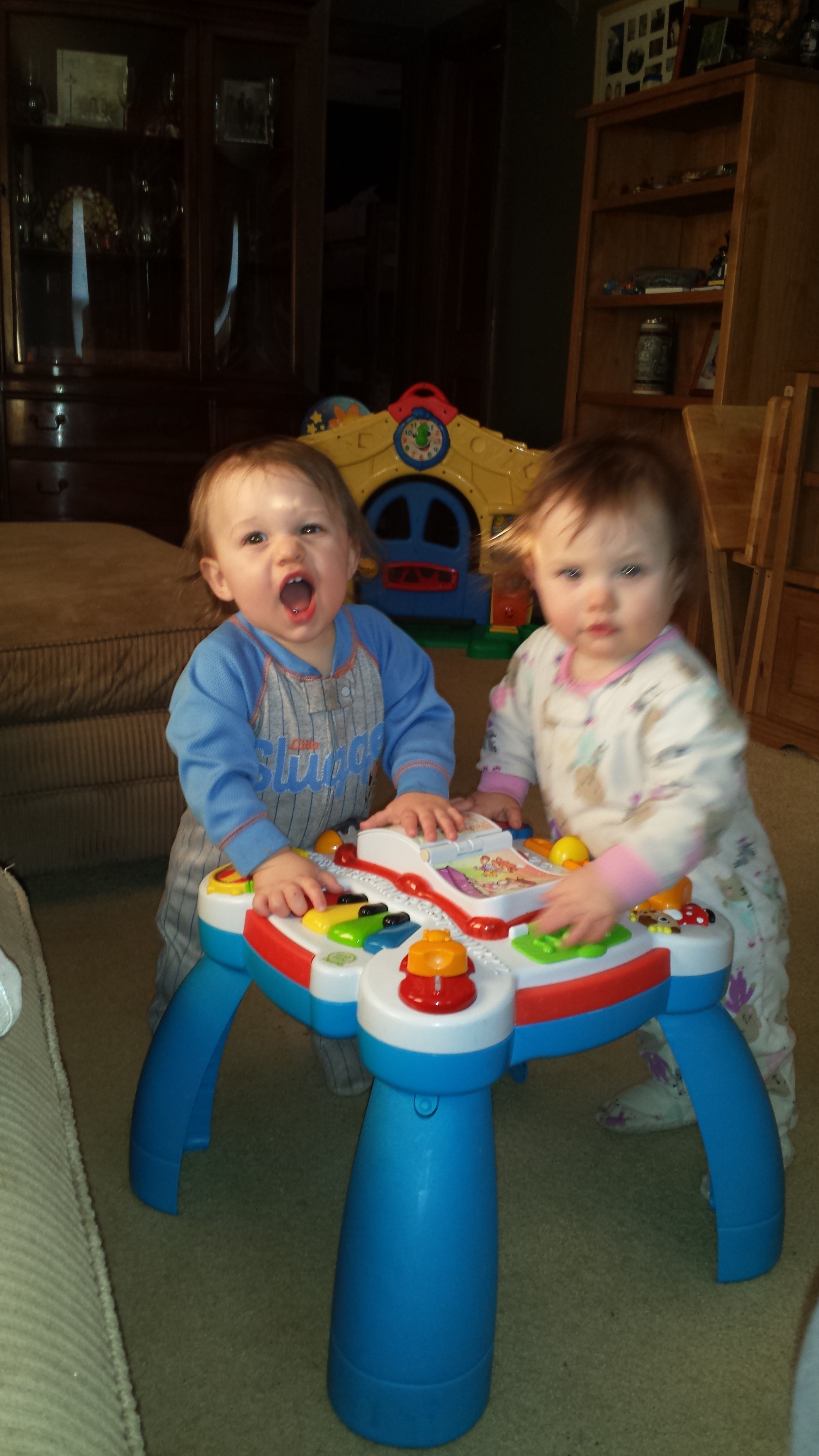 Which brings us to today, when they have turned 14 months old. It doesn’t seem possible that so much time has passed, and yet here they are.  Molly is walking and running. Gus finally gave up the army crawl for regular crawling, but really has no interest in doing any walking himself.  They chase each other around. They play together and babble at each other and it is really just the best thing ever. Well, except for when they kiss and hug each other.  THAT’S the best thing ever. There is also a fair amount of rough housing, hair pulling and slapping. I guess it’s to be expected, but damn.