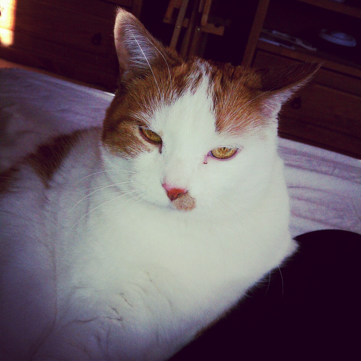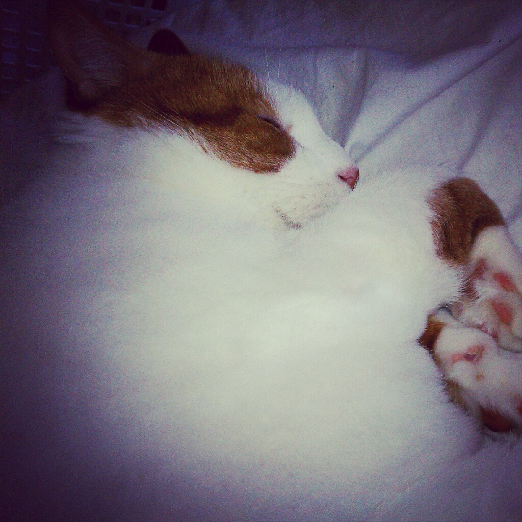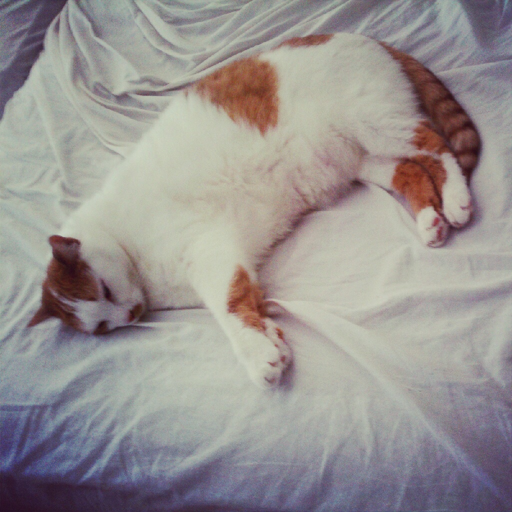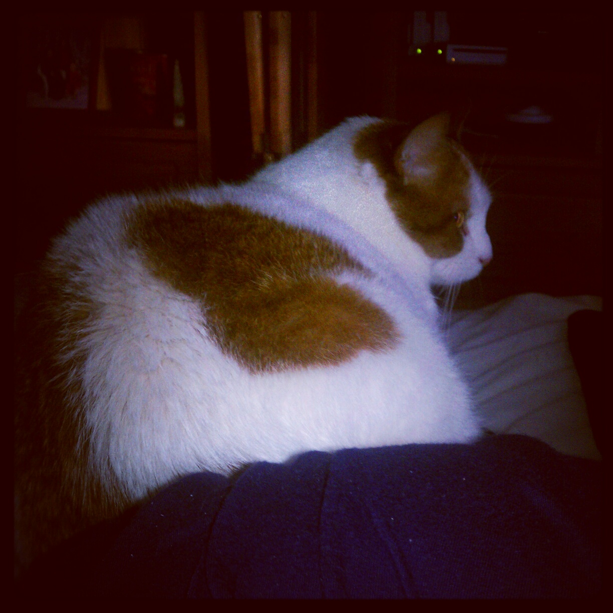 On a cold November day in the year 2000, Ed and I went to the SPCA to get our first pet together. We’d been caring for his mom’s cat for a while and she was taking her back, so we wanted to get a cat of our own. I was hell bent on getting a female orange cat–it was all I could think about. And then we walked in to the room full of kittens, and this tiny little boy cat, white and orangeish brown, scaled my leg and body until he was perched right on my shoulder. And there he stayed, even as we looked at other cats. He wasn’t what we were looking for, but there was no questioning that he was ours. He picked us.