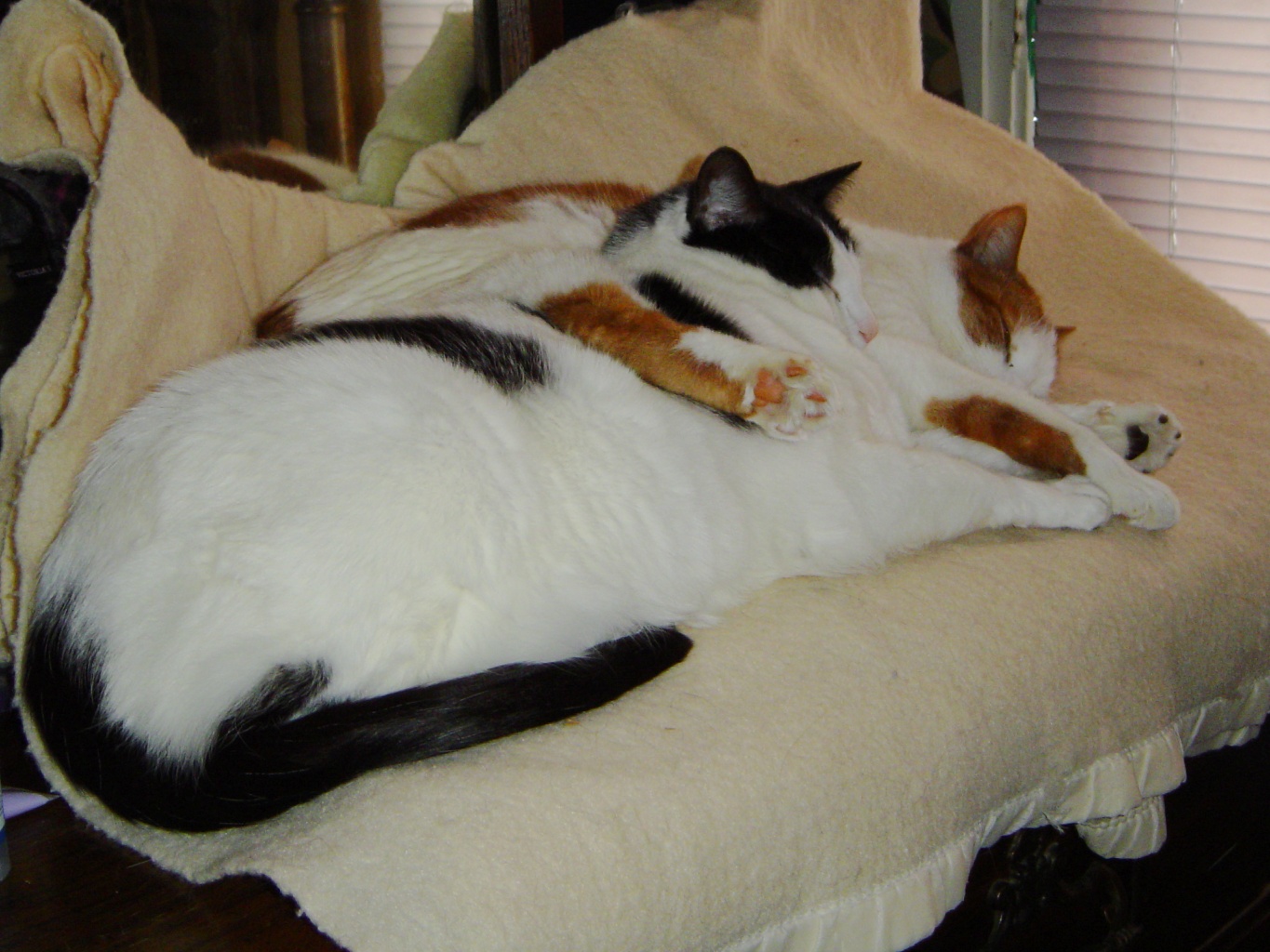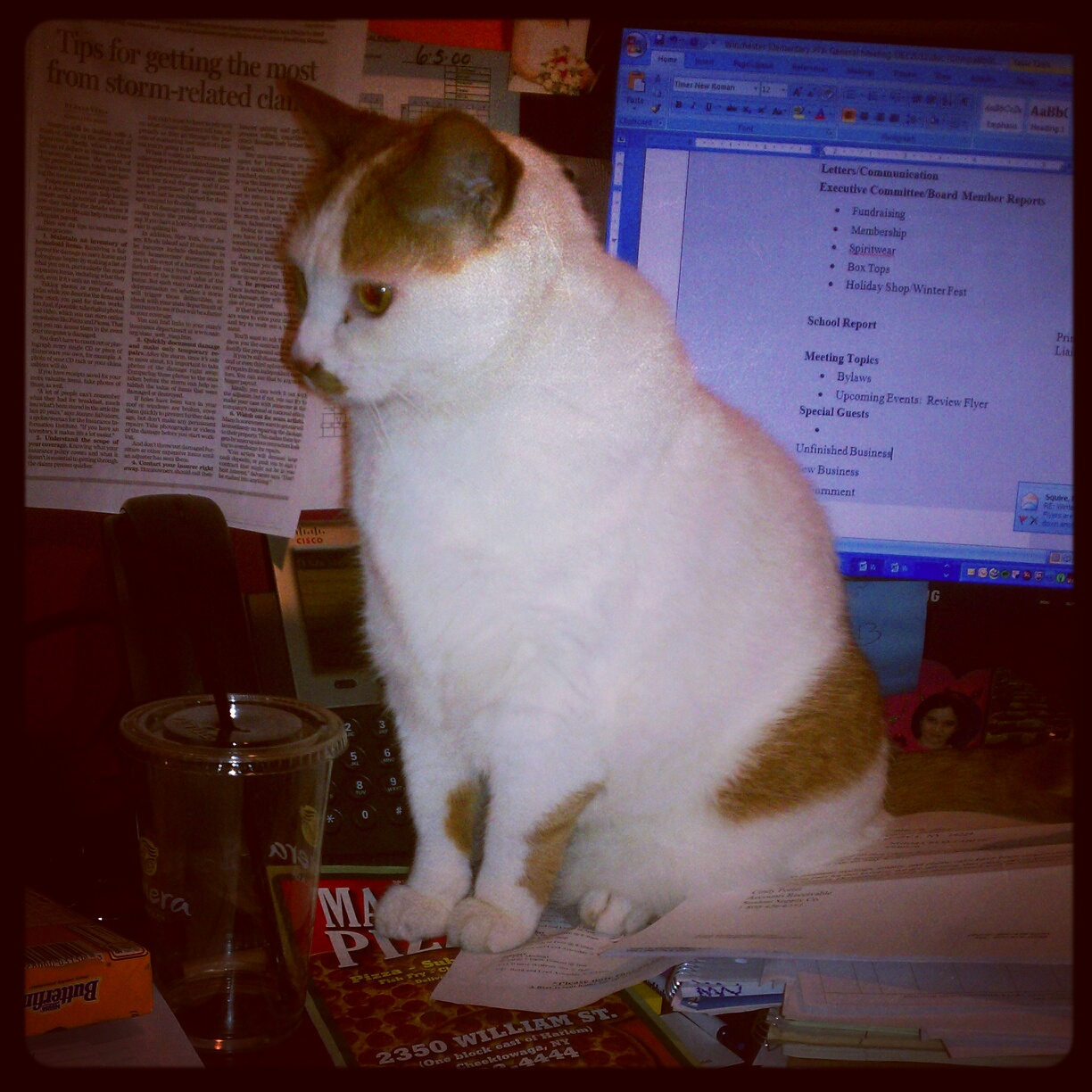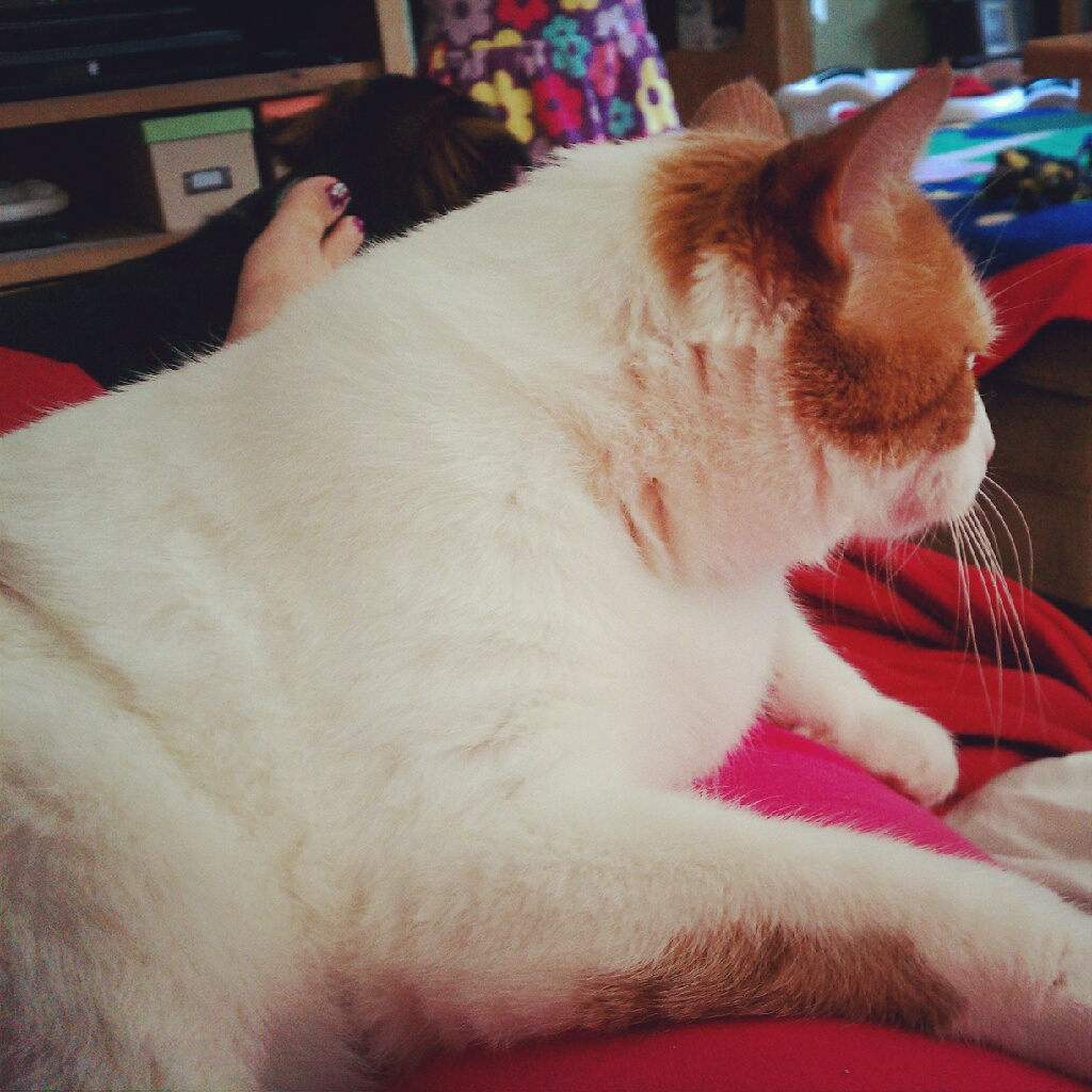 On a cold November day in the year 2000, Ed and I went to the SPCA to get our first pet together. We’d been caring for his mom’s cat for a while and she was taking her back, so we wanted to get a cat of our own. I was hell bent on getting a female orange cat–it was all I could think about. And then we walked in to the room full of kittens, and this tiny little boy cat, white and orangeish brown, scaled my leg and body until he was perched right on my shoulder. And there he stayed, even as we looked at other cats. He wasn’t what we were looking for, but there was no questioning that he was ours. He picked us.