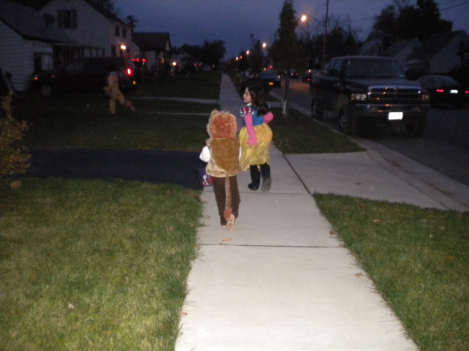 We had a great Halloween. It was warmer than we thought it would be (around 50 degrees) and the kids were very excited. Their ultimate goal was to make it up one side of the street (we are the 1st house) and all the way back down. I am pleased to say that we made it, even Liv. Although, the pillowcase Bud brought along to contain ALL OF HIS CANDY ended up being the catch-all for all 3 kids’ candy and guess who got to carry that sucker. Yep, me. Bud’s friend who came with us was all up in arms over the fact that there was one bag housing the candy of 3 kids. I blew his mind further to tell him that they all share the candy, and that we hardly let them keep any of it. It’s true; it goes in the freezer and it lasts all year long. We are mean, mean parents, I suppose. Anyway, here they are, Liv the Lion, Snow White, and Darth Vader. Get a load of Liv’s tail!!