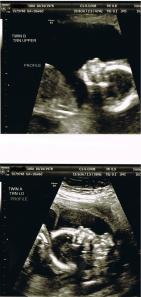 I really enjoyed seeing shots of their profiles.  Maybe all babies look the same in utero, I don’t know.  All of my babies distinctly show Ed’s lips and my nose though.  Baby B, the boy baby on the top…already looks just like Eddie in there.  It’s uncanny.  We didn’t get a great shot of Baby A, because she NEVER stops moving.  I can see it though.