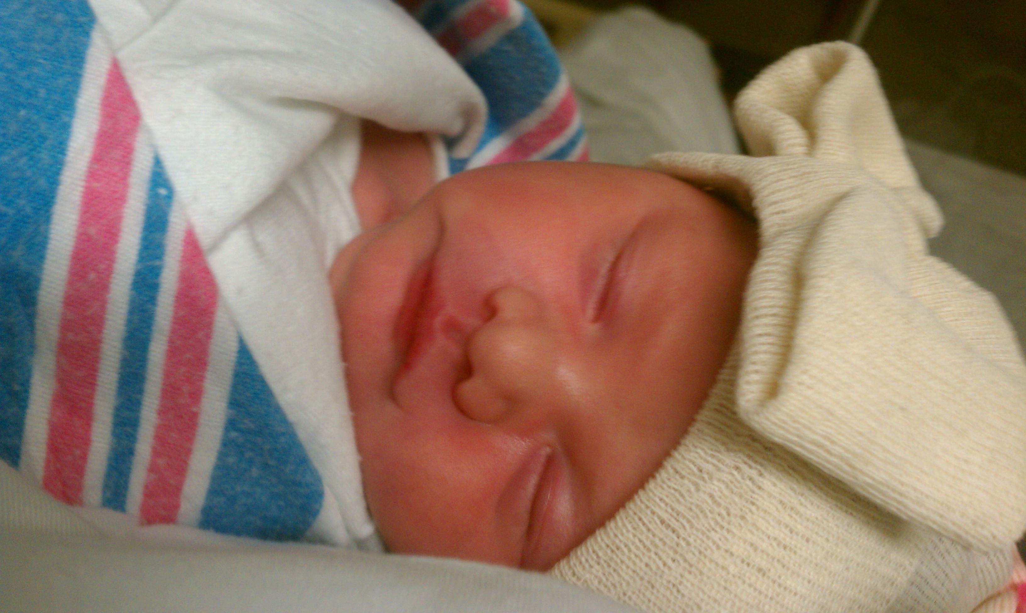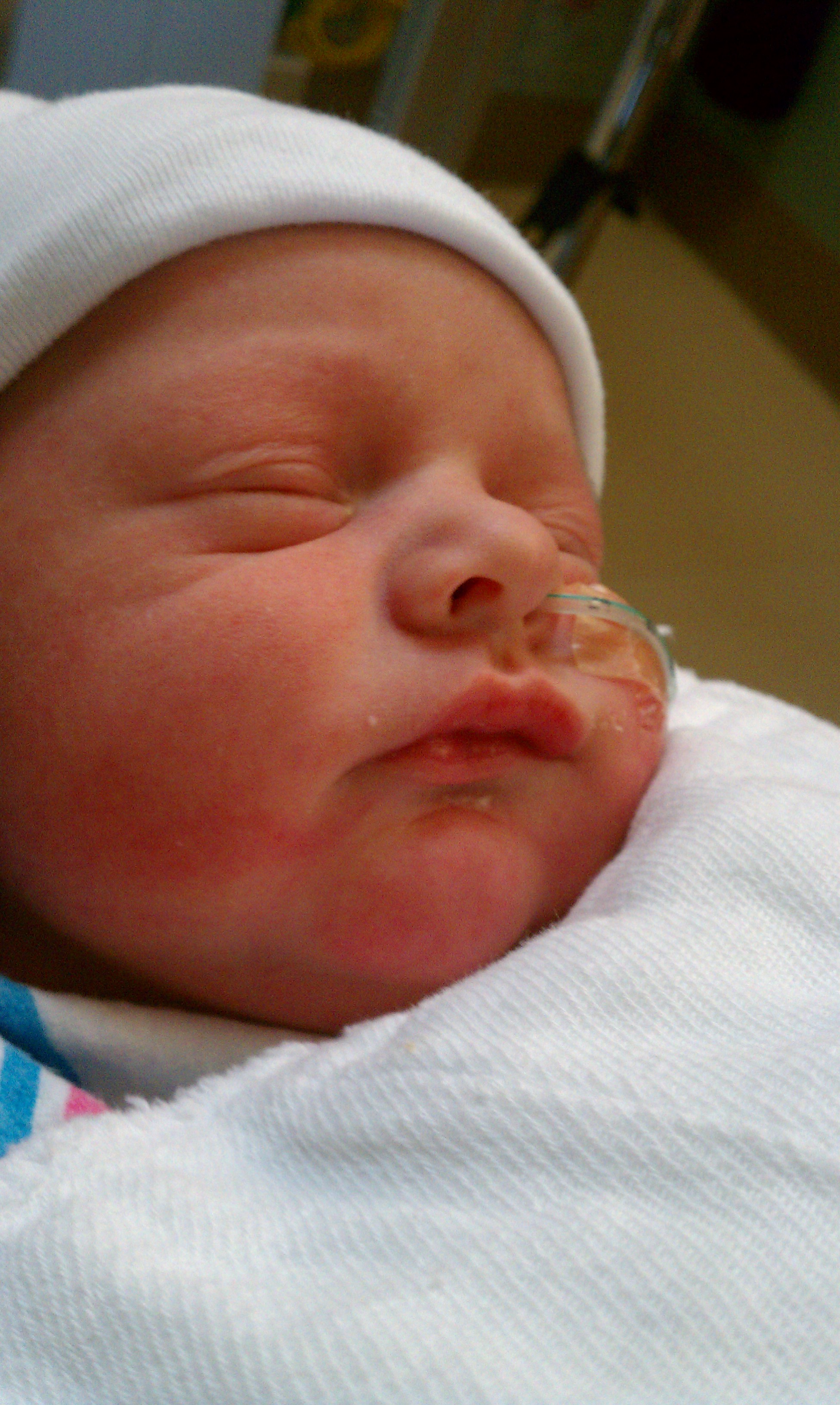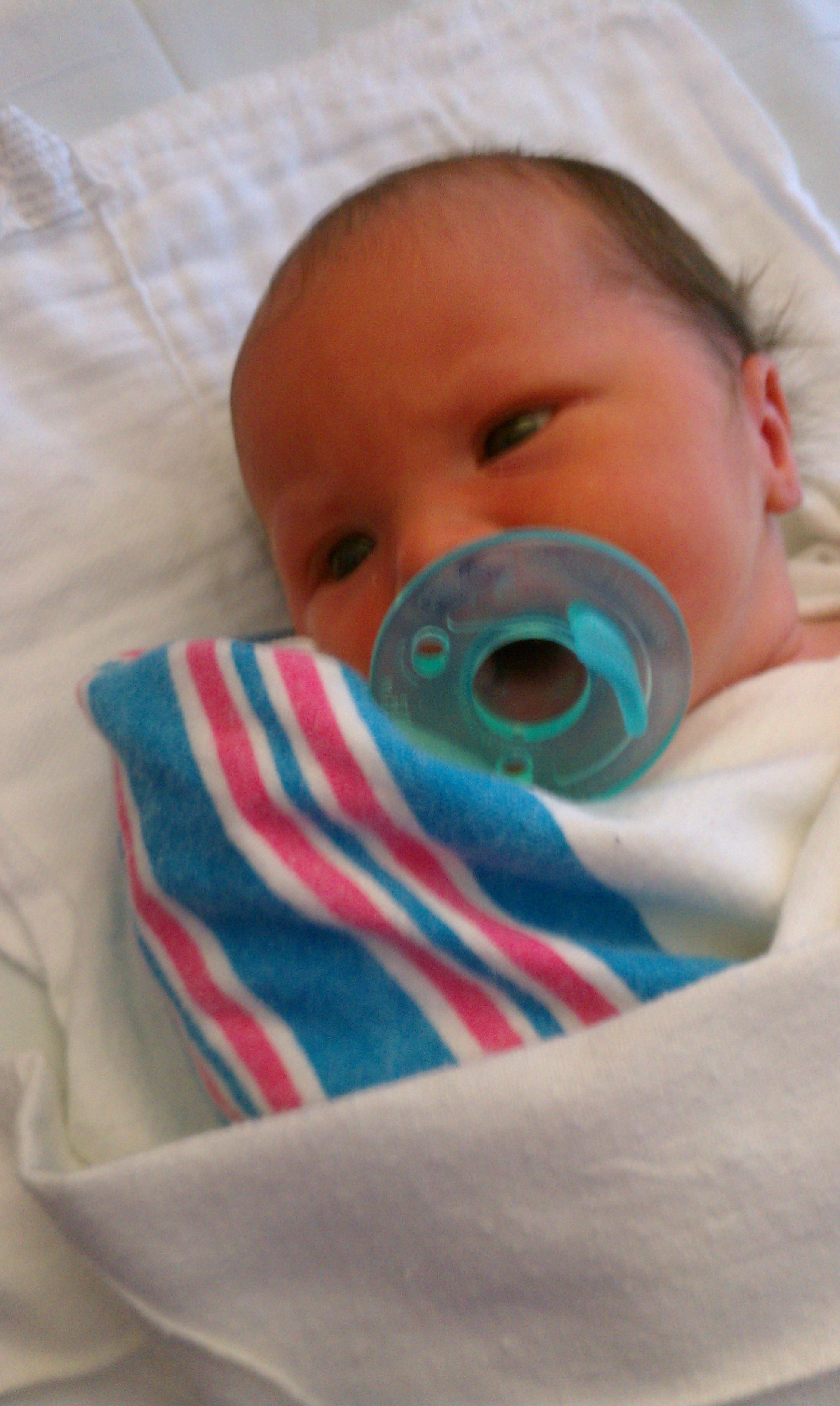 We got to the hospital, and got Hannah situated in Aunt G’s car and I insisted on walking in to labor and delivery, and managed to soak all the way through my pants on the way in, so that was nice. There was paperwork, and then we were put in a combined triage/recovery room because there were no labor and delivery rooms available. I changed in to a gown, splatted more water all over the floor, and did not need a litmus test to determine that my water had in fact broken. We were there to stay.