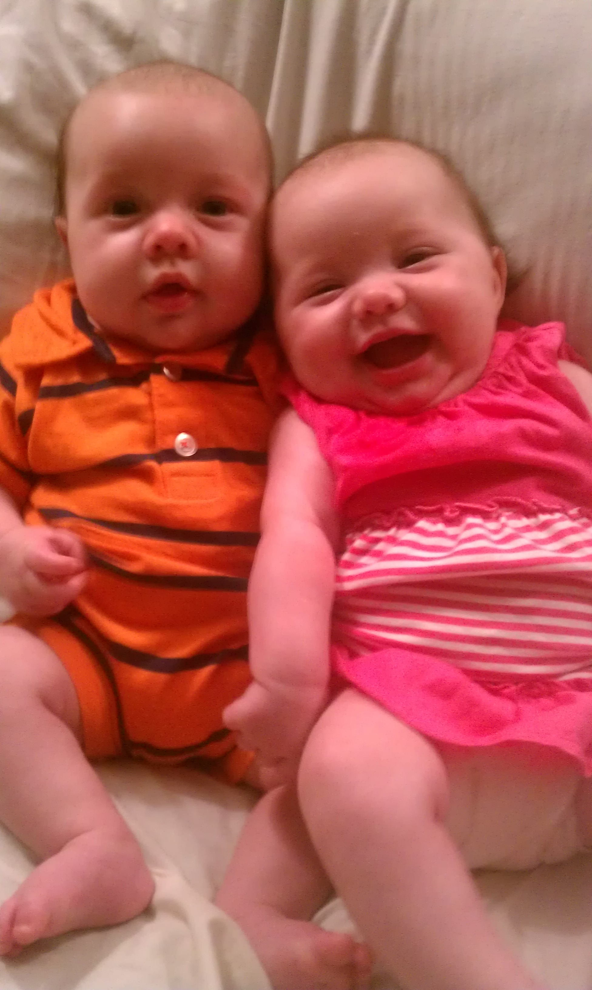 Molly, who was low in my belly, came out like a breeze. I didn’t even feel the tugging and shifting everyone had warned me about. She was born at 5:07 PM and the dr. peeked her tiny head at me around the corner before taking her to get cleaned up. She screamed her fool head off the whole time. Angus was a different story. I could feel them trying to maneuver him out, but he was wedged so high up under my ribs, they were having a hard time. It took a lot of manipulation, leaving his poor feet and legs black and blue, but he was out at 5:11PM. Again, the doctor peeked his head around the curtain and he was taken to be assessed.